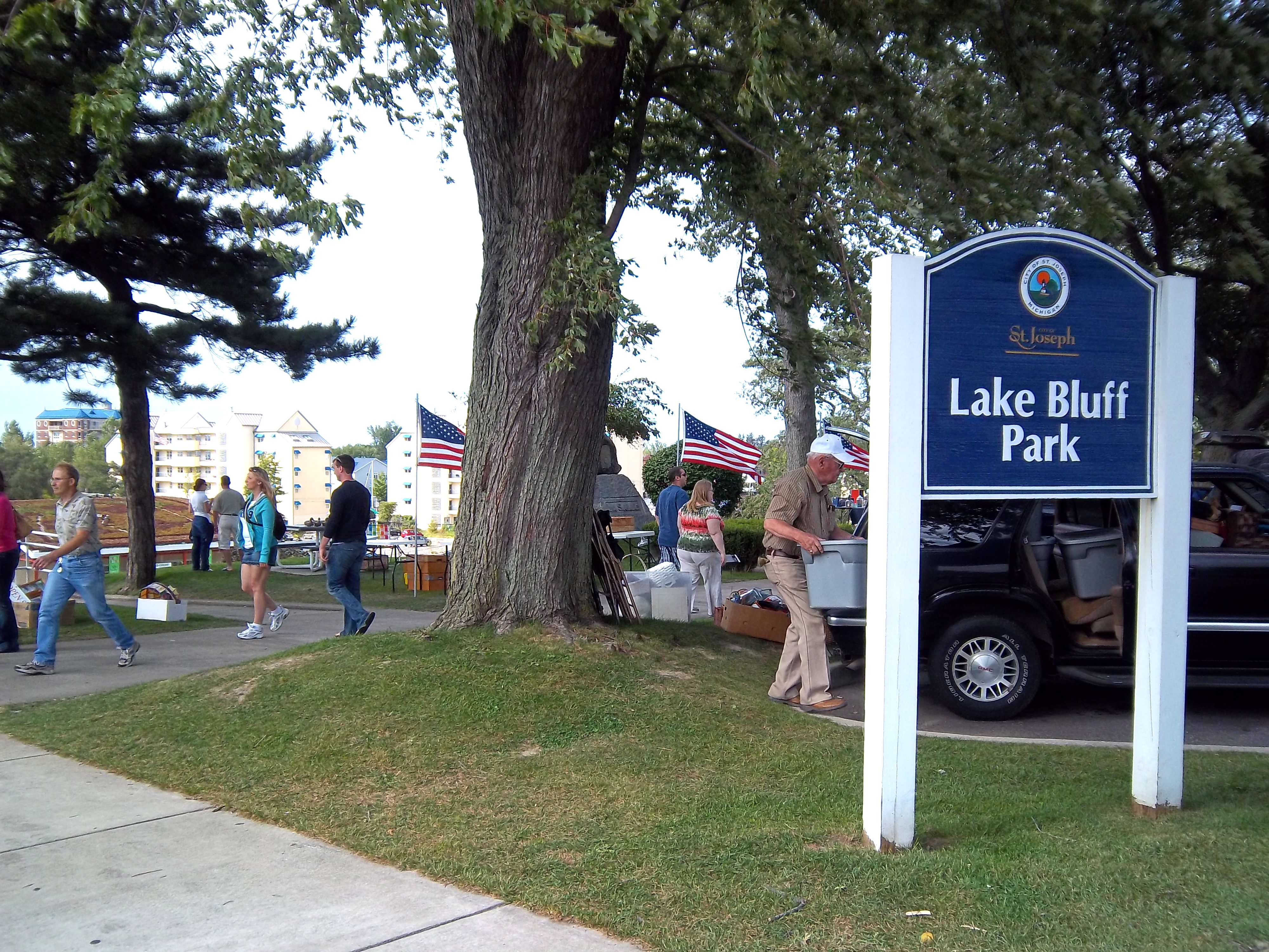 このBluff(ブラフ)とは、辞書では「断崖」「絶壁」など、物騒なイメージとなっているが、ここSt. Joseph のBluffは、もっとおだやかなものです(笑)。シルバービーチがもっと低い土地で、それより一段高い高台のようになってて、そこに公園、ダウンタウンがある。Bluffからシルバービーチもミシガン湖も見渡せる