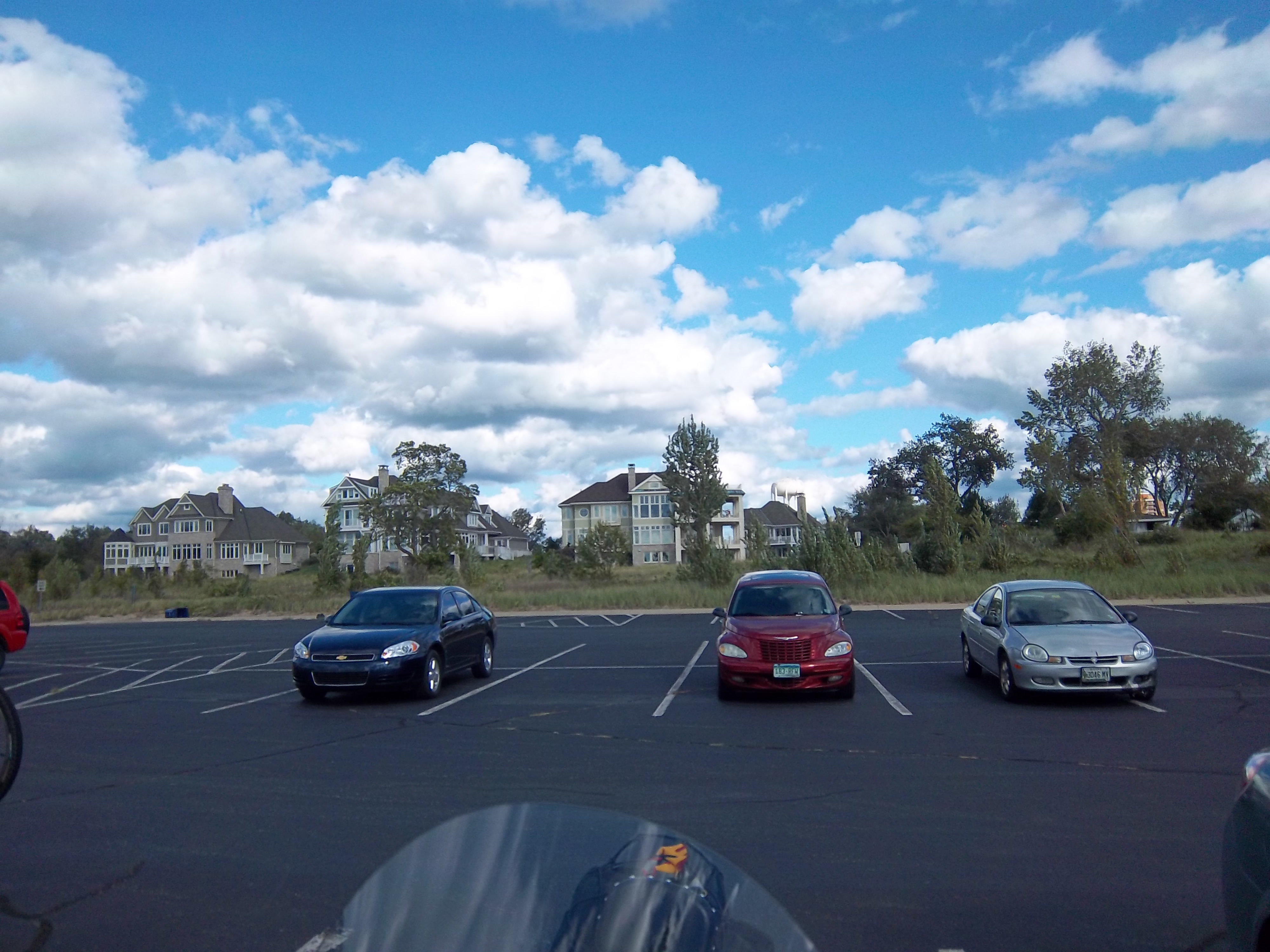 テイスコニアビーチの駐車場。有料。1日で5ドル前後だったと思う。他に駐車できるところはないので、観念して払うこと! 後ろに、大邸宅が見える。こういうのを「ミックマンション(McMansion)」(マクドナルド(McDonald’s)のもじり)と呼んで軽蔑する声もある。