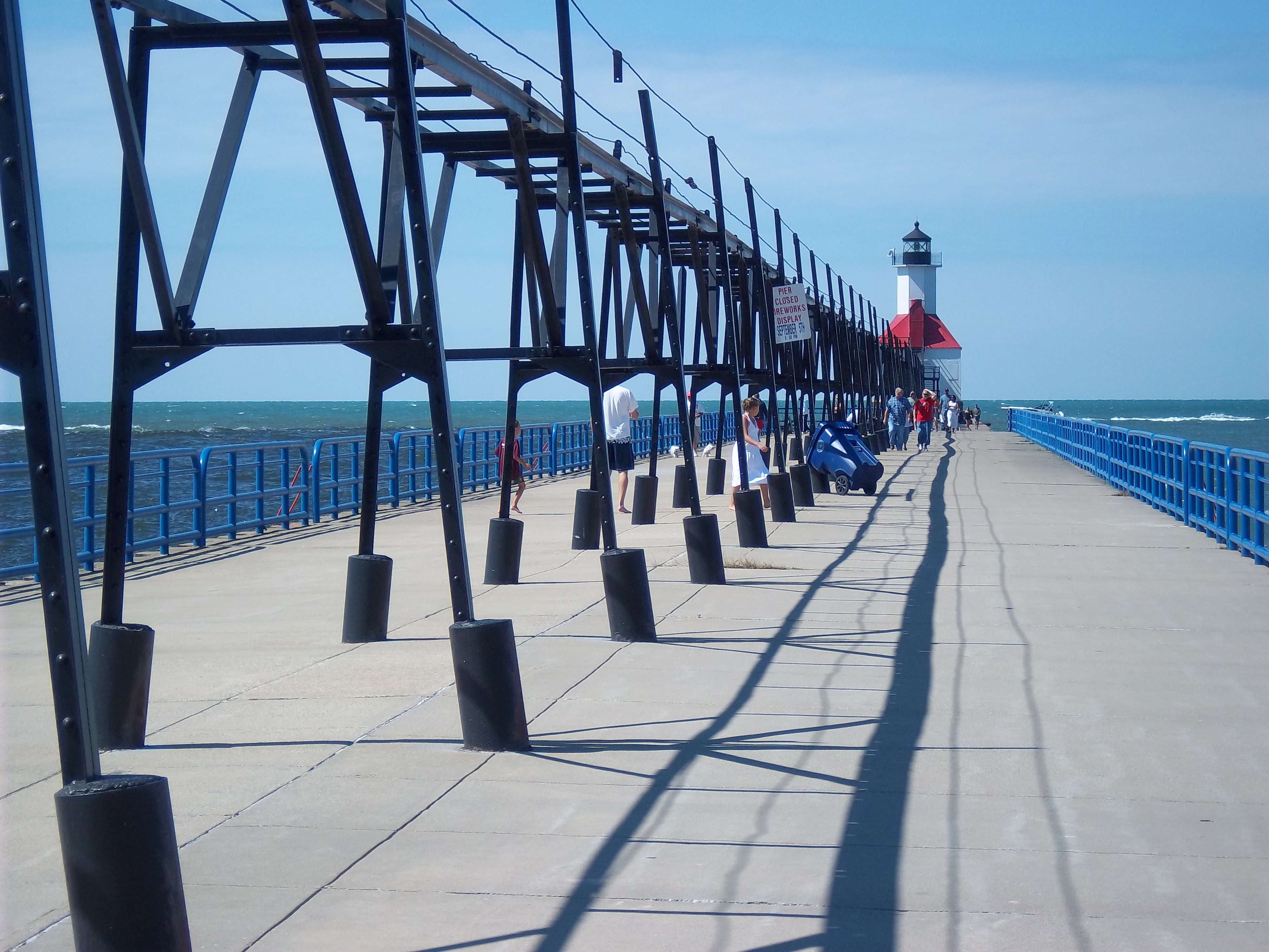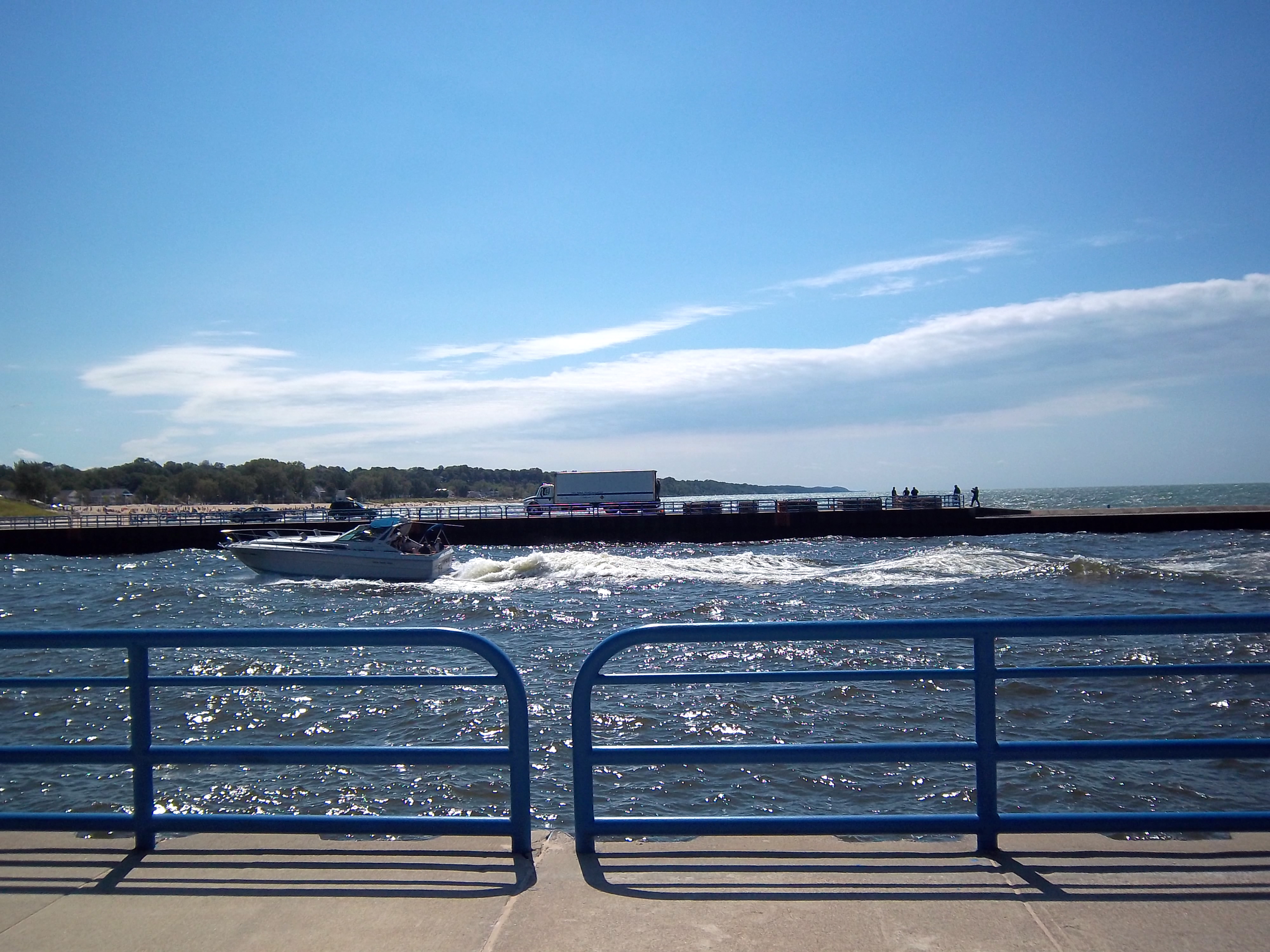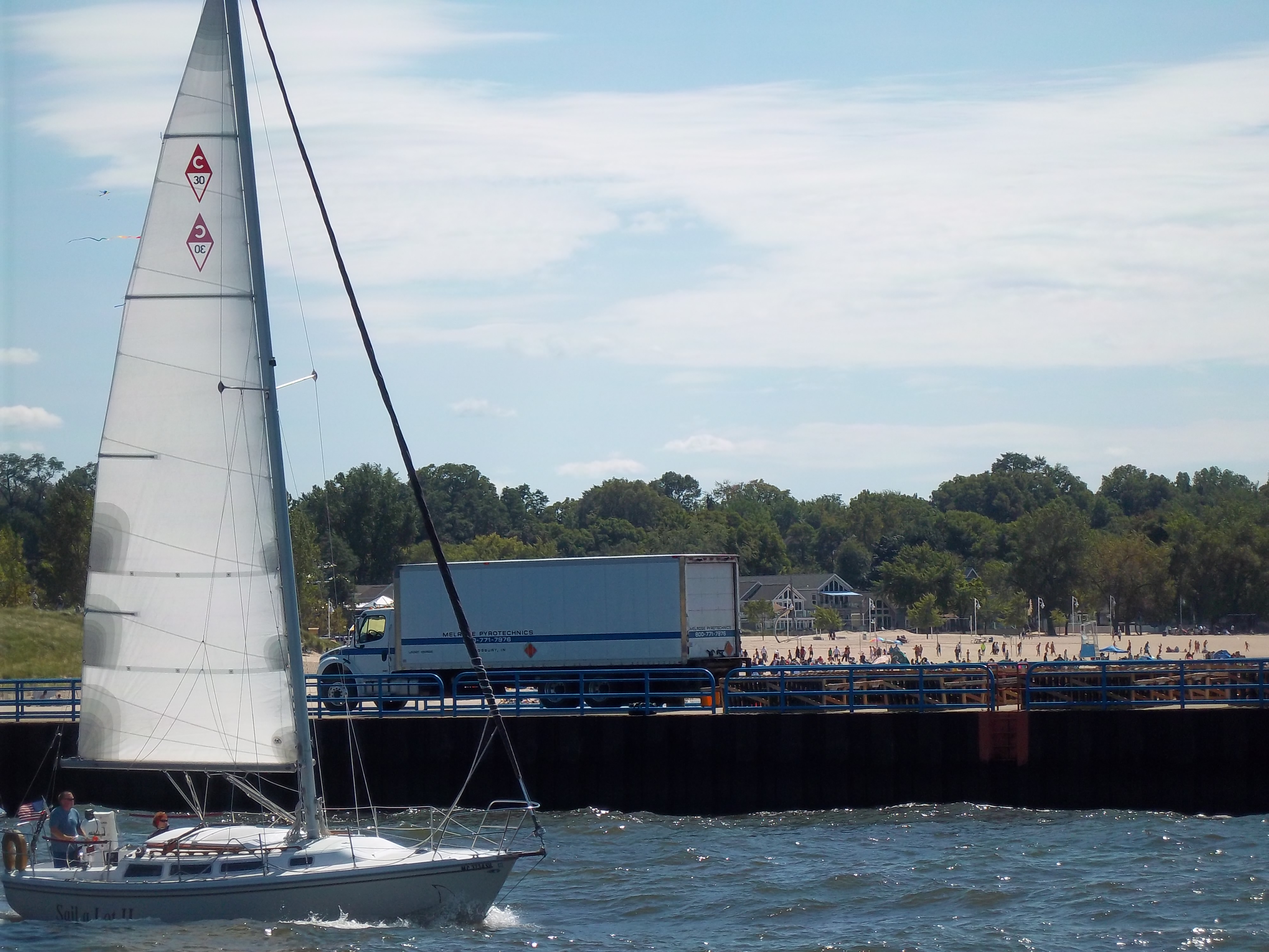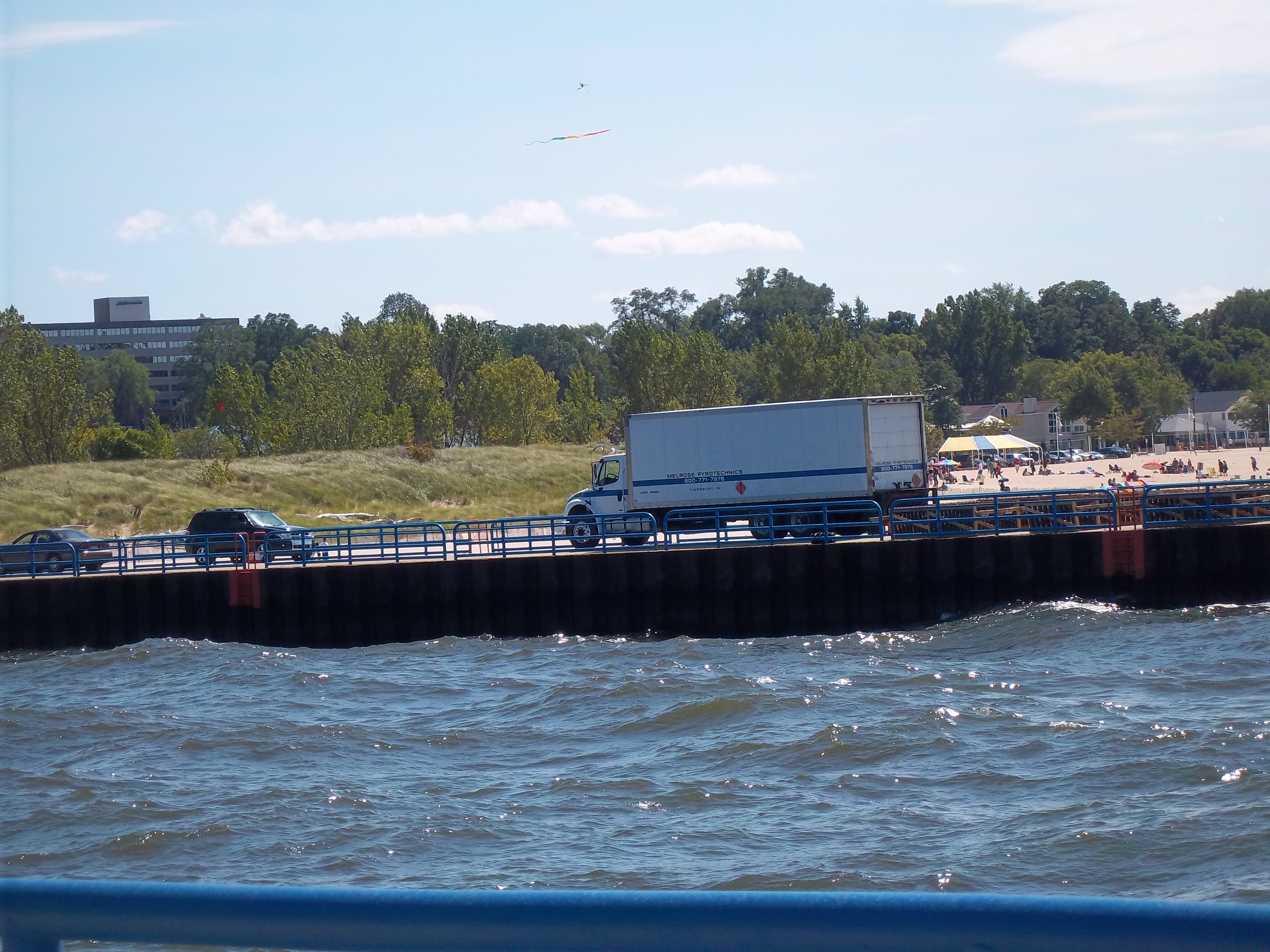 埠頭を灯台に向かって歩いてゆくと、左側にSt Joseph Riverをはさんでシルバービーチが見える。ボートの後方に見えるトラックは、この日の夜ここで打ち上げられる花火の準備のため。この日は独立記念日(7月4日)。独立記念日には毎年ここから花火が打ち上げられ、人々はシルバービーチに座って、またはダウンタウンの目玉のひとつであるBluffの芝生に場所を陣取って、花火を楽しむ。