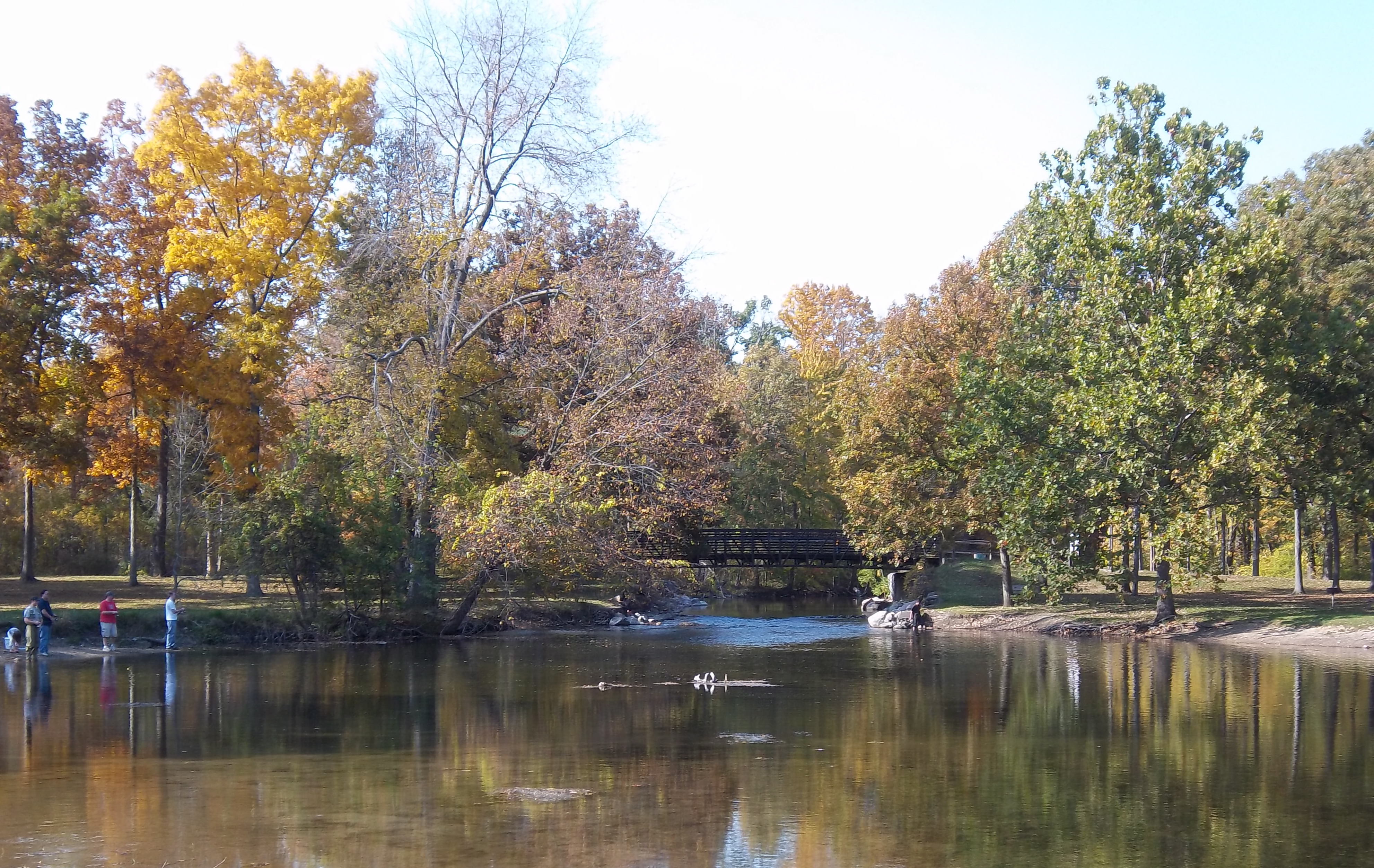 There was a group of people who were fishing in the river. The entire park is very quiet and empty.