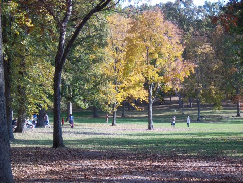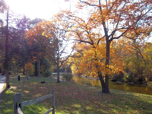 I saw a woman power walking. I saw another woman riding a racing bicycle. Lots of people were walking their dogs. A lot fewer people than in summer because there are football games on autumn Saturdays. American men in the parks on an autumn Saturday afternoon must belong to the minority group who are not interested in football.