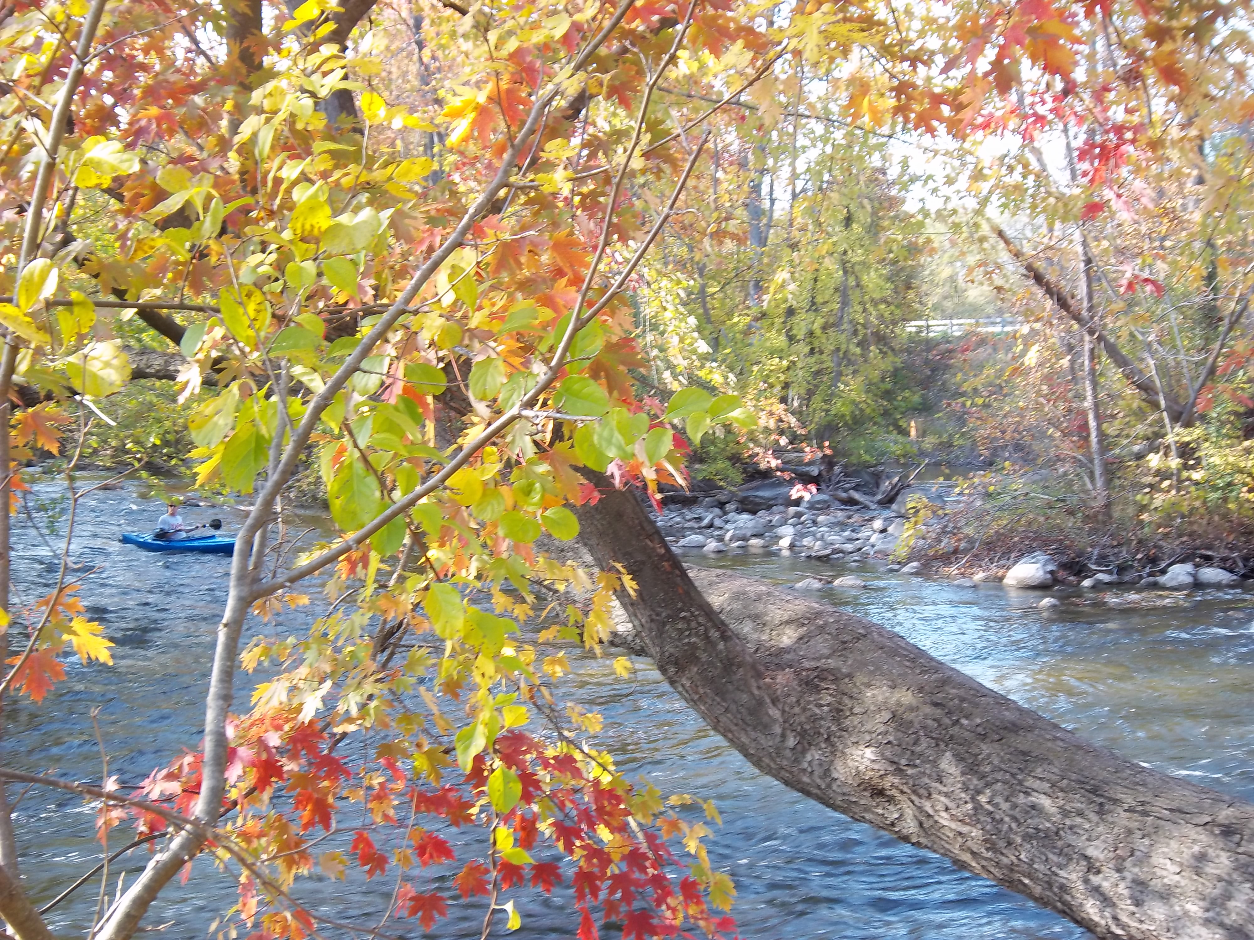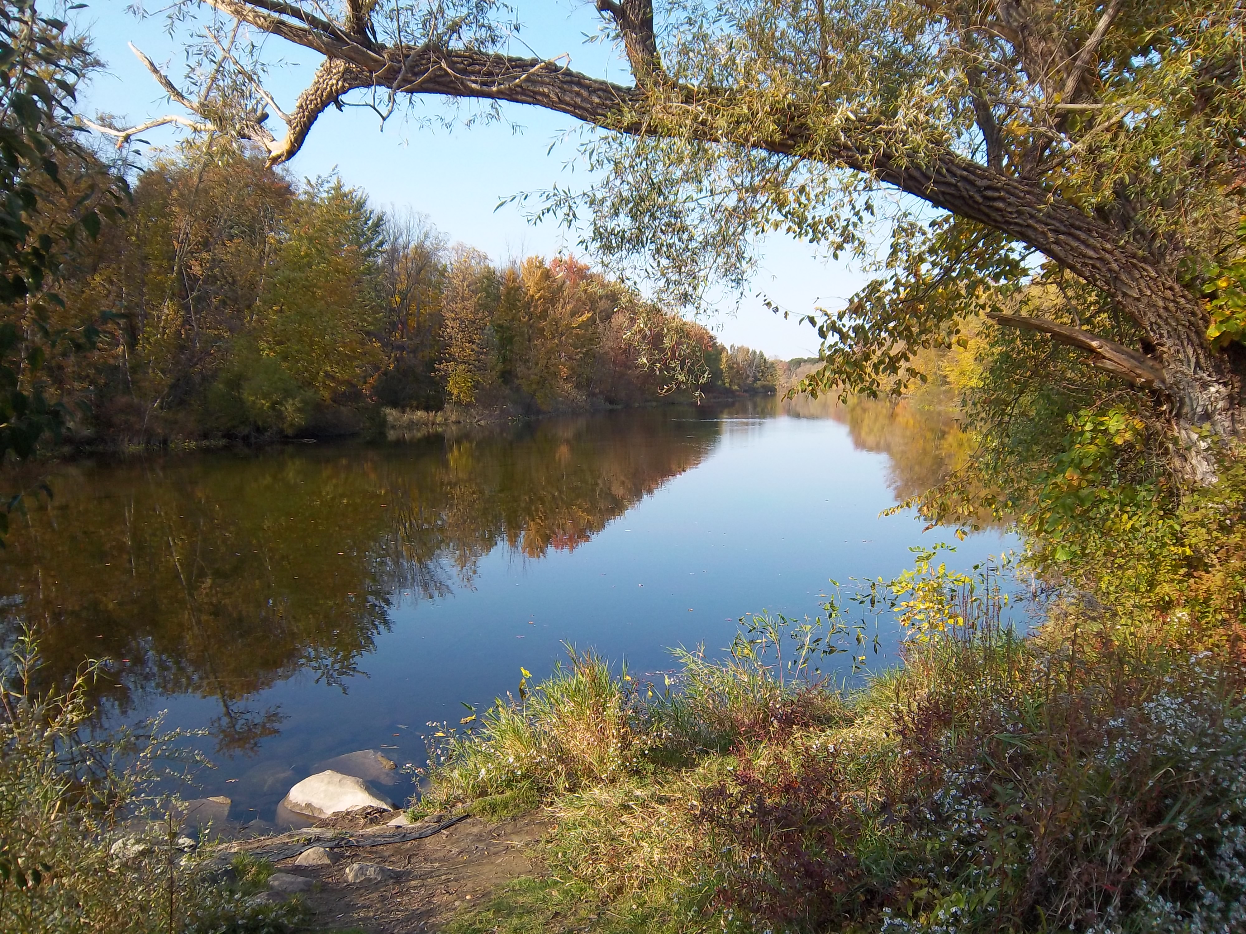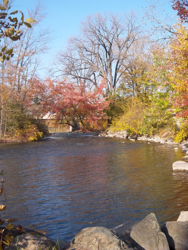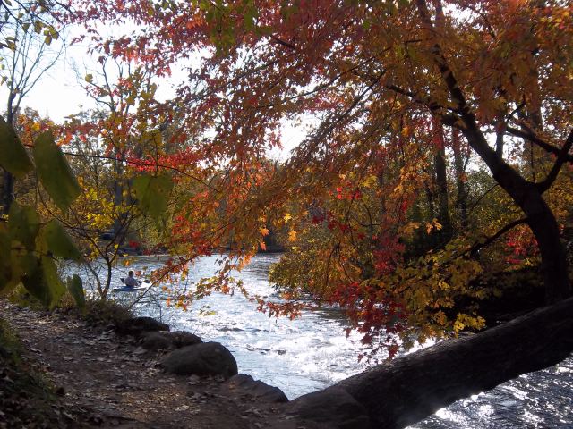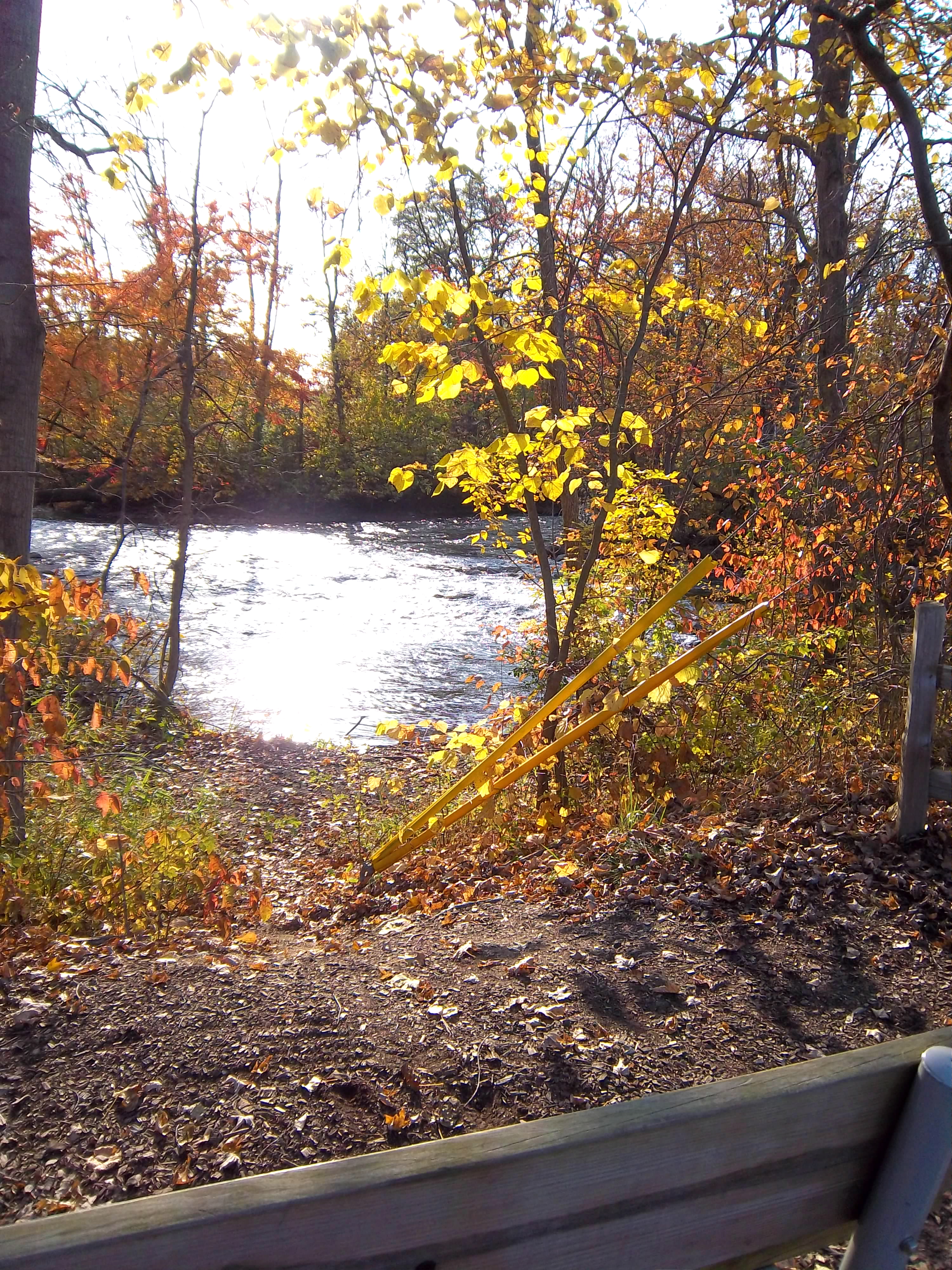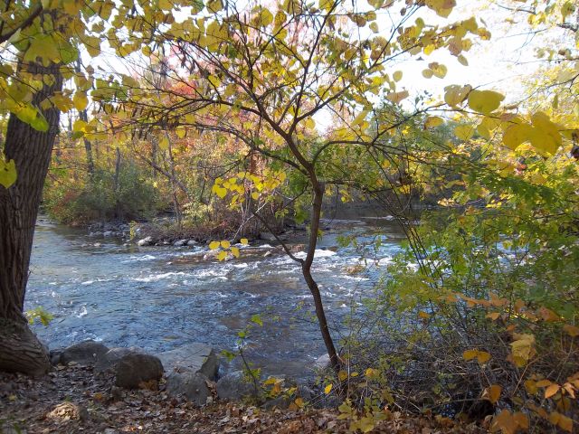 (余談)昔、ある秋の週末、夫の同僚たちとここでピクニックした時、同僚の女性(米人)が自分のカヌーを持ってきて、この川でカヌーに乗った。と、突然彼女はカヌーから飛び下りて、股まで川につかってカヌーの方向を360度回転させ始めた。ジーンズをはいたままで。私は驚愕した。「ジーンズが濡れちゃうよっ!」そしたら、彼女の反応は「それがどうしたの?」 (米人の)亭主に聞いても「ごく当たり前のこと」。カルチャーショックを無数に経験したが、そのひとつを味わった日だった。