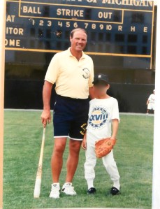 Prior to that, the Tigers won the World Series in 1968. Mr. Bill Freehan, the best catcher of the major league in 1968, was one of the stars on the Tigers then. He was the head coach of the U of M baseball team in the 1990s. He offered the youth baseball camp in every summer and my two sons attended it for a few years. My sons had great fun. Here is the photo of one of my sons with Bill Freehan (I erased my son’s face, but did not erase Mr. Freehan’s. Oh, he is a public figure. It’s OK, isn’t it?). Freehan was a star long before my sons were born, but they sure respected Freehan and were excited to be near him.