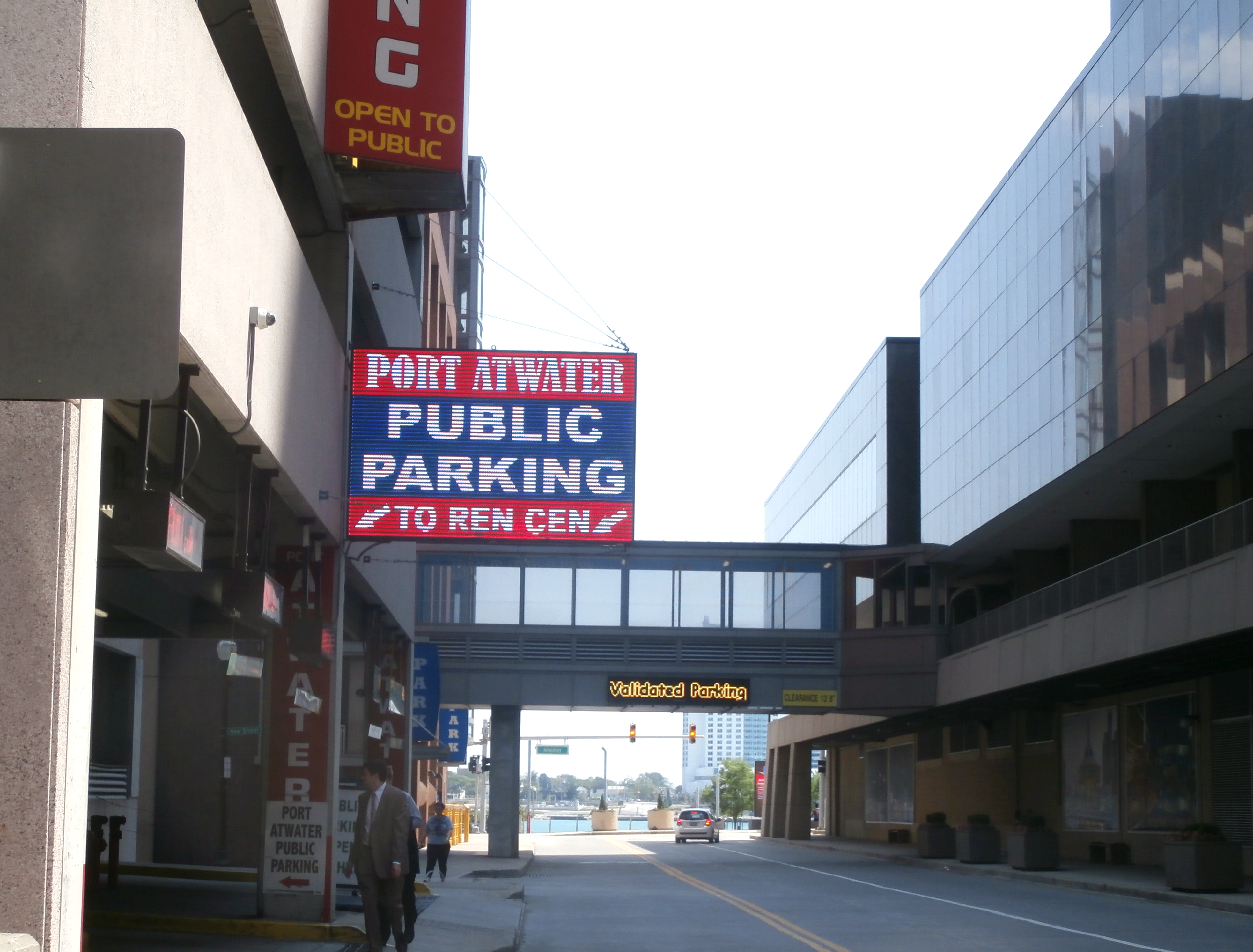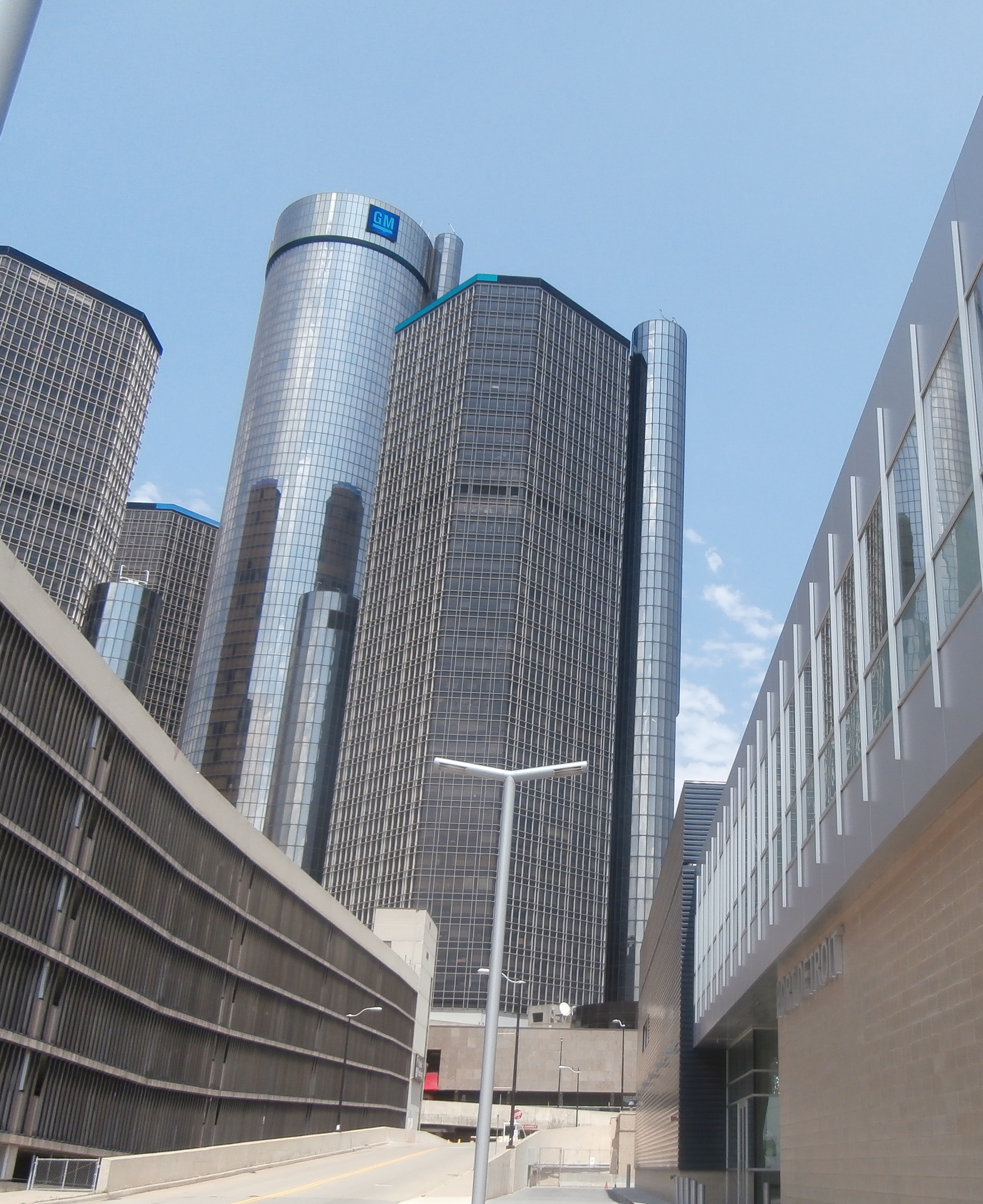 裏手に回ると、見慣れた、しかし世界に冠たるジェネラルモータース (GM) の本社があるRenaissance Center がそびえ立つ。