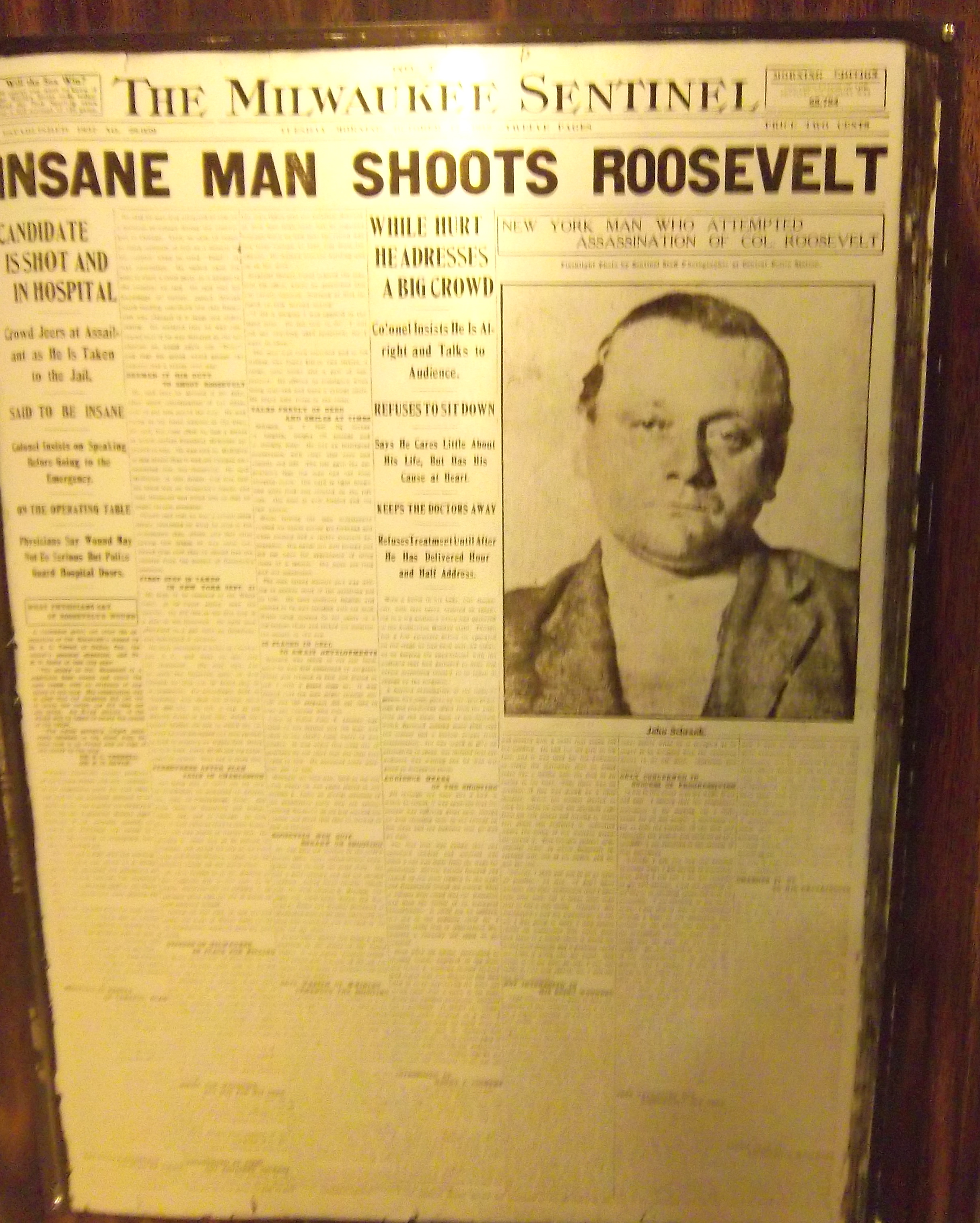 セオドア氏は、Hotel Gilpatrickに立ち寄り、地元の名士たちと夕食をした後、近くの会場(現在のMilwaukee Theatre)での演説へ向かうためホテルの外に出て、群衆に挨拶をしながら車に乗ろうとする時に、撃たれたそうだ。