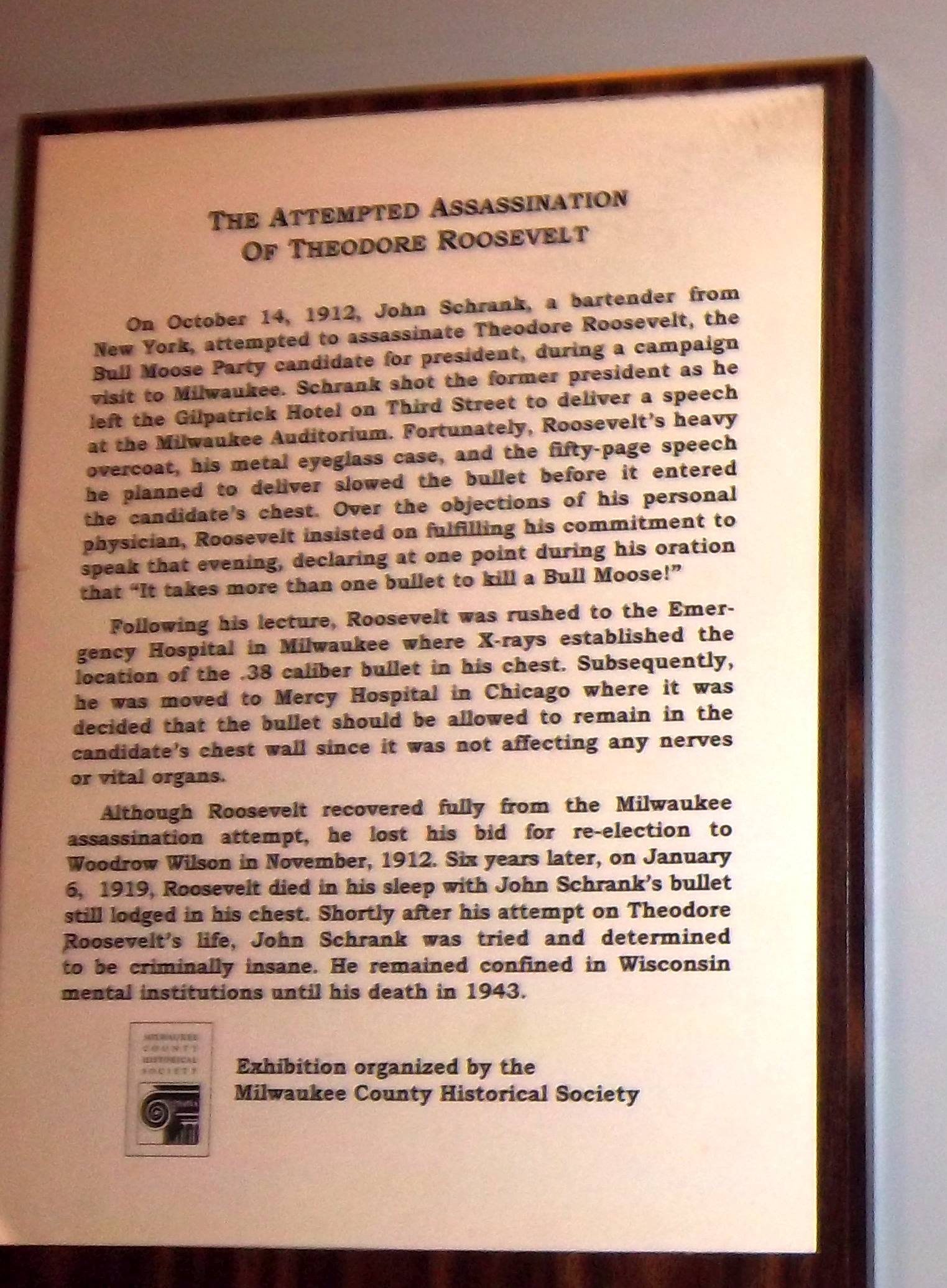 セオドア・ルーズベルトの暗殺未遂があったということさえも、私は知らなかったのだが — いつもながらの無知で、ミシガン湖をフェリーで横断してミルウオーキーに遊びに行った時(フェリーでミシガン湖横断、いざミルウオーキーへ(Crossing Lake Michigan))、ミルウオーキーで泊まったホテルがたまたま、その暗殺未遂の場所だったので、初めて知ったのであった。