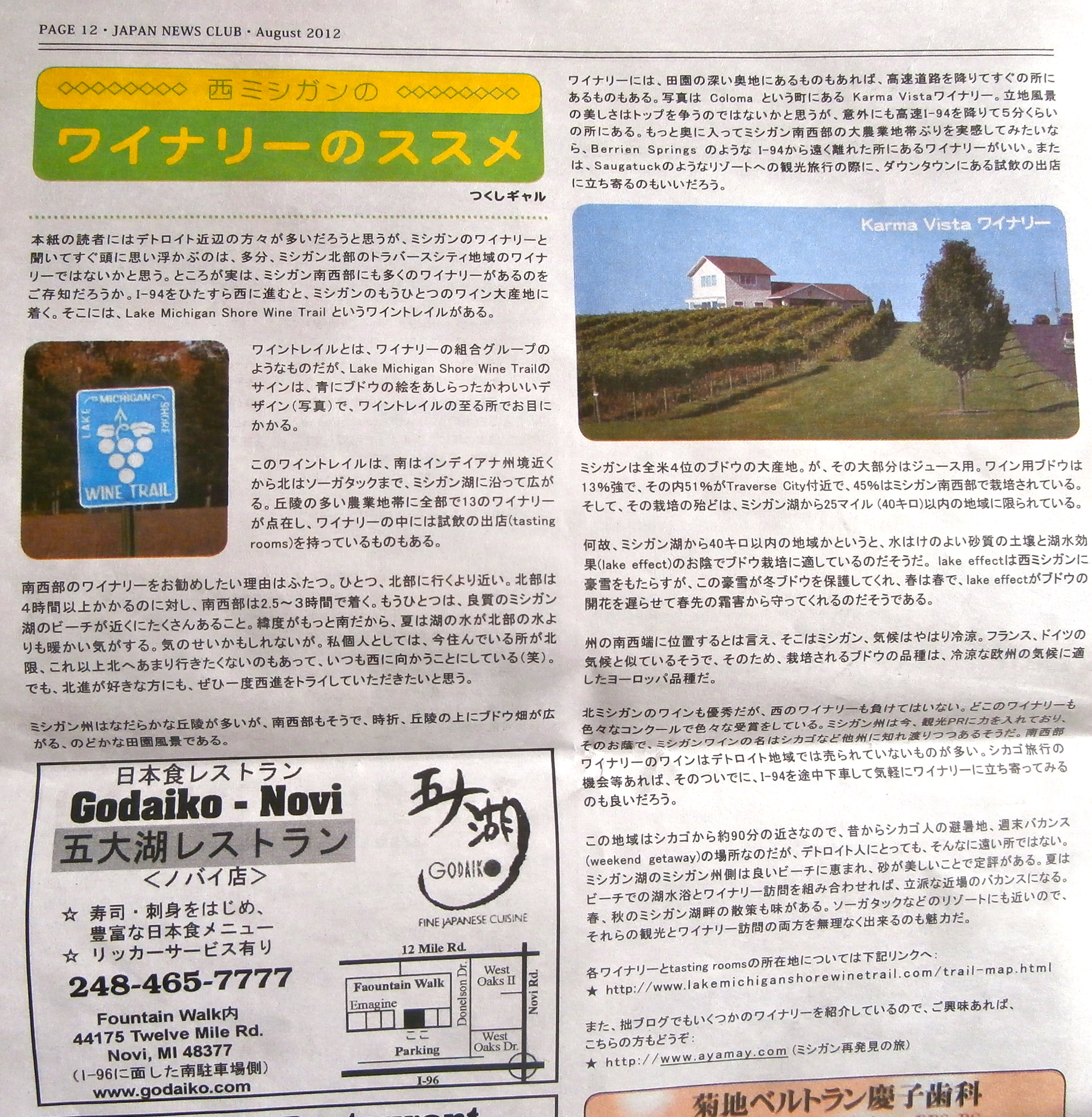 The Japan News Club is the monthly newspaper for the Japanese communities in the metro-Detroit and other areas in Michigan and in neighboring states. I have written about the Lake Michigan Shore Wine Trail, the cranberry show in South Haven, the trans-Lake Michigan ferry, and blueberries in Michigan. I would like to write about more things I discover in the Lake Michigan region.