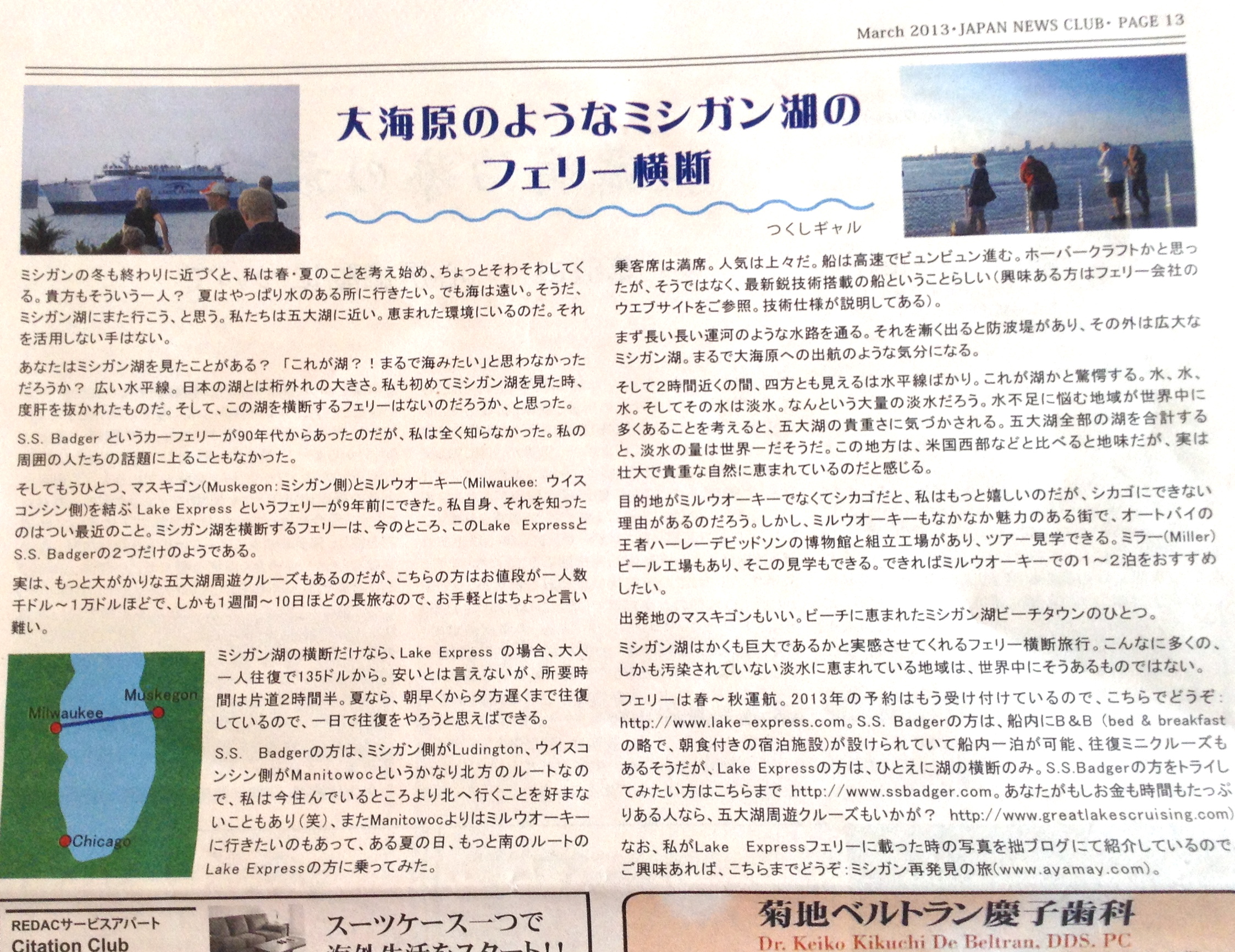 2013年3月号の記事です。ミシガン湖横断フェリーについて書かせていただきました。