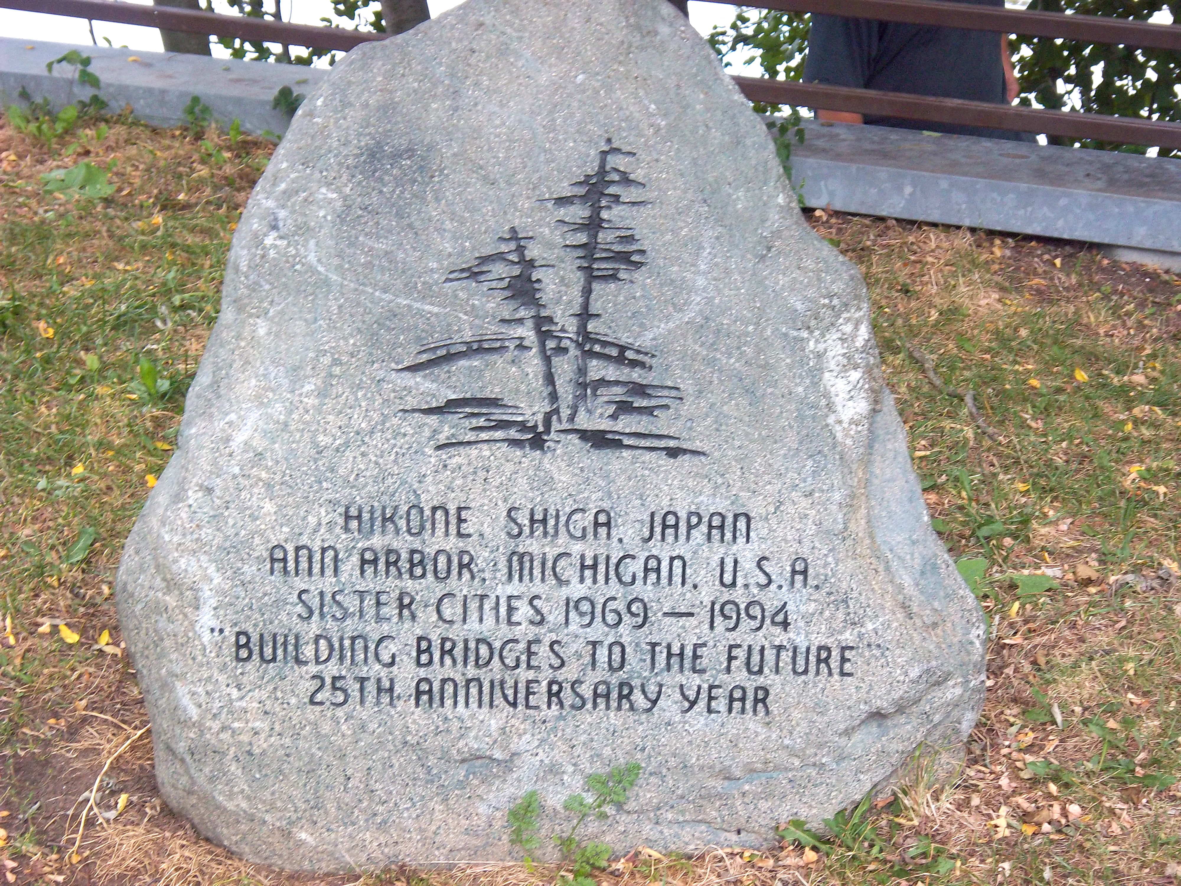 日本の滋賀県彦根市とアナーバーは姉妹都市だ。その記念石がこの公園にある。 (なぜ彦根市なのか。それは、アナーバー市内にHikone St. という通りがあるからだ。なお、これは「ハイコーン」と読む。なお、残念なことに、Hikone St. はあまり良いご近所ではない。。)