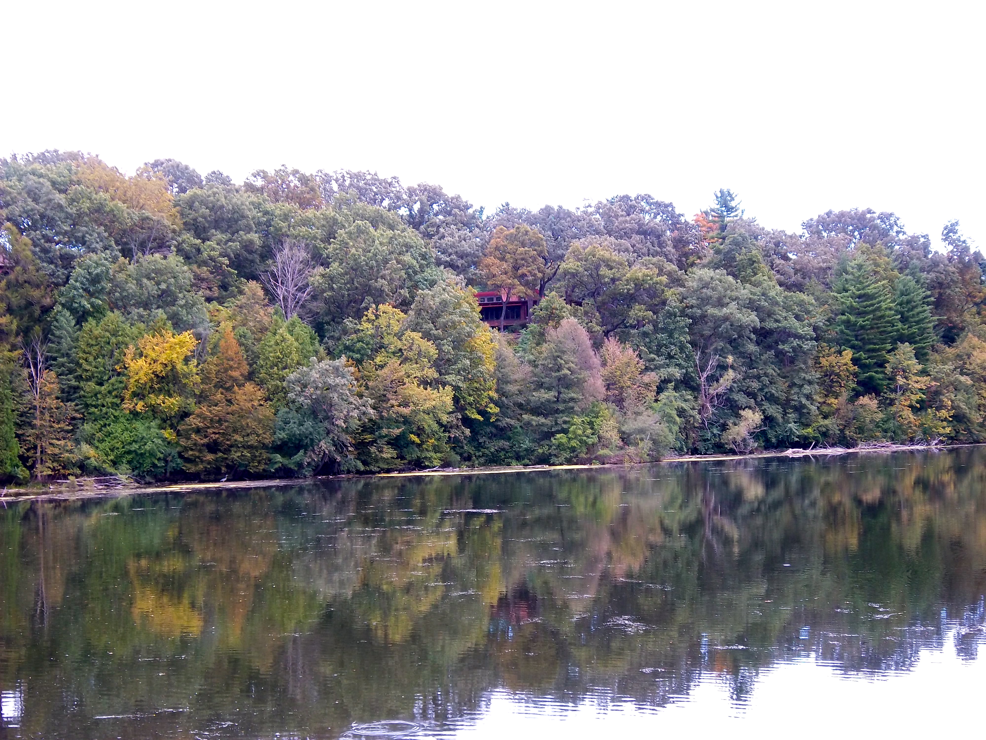 If you look closely, can you see a red house in the middle of the woods? Whose house is that? It’s been there for a long time. In winter you can see the entire house with the leaves fallen – it’s a huge mansion.