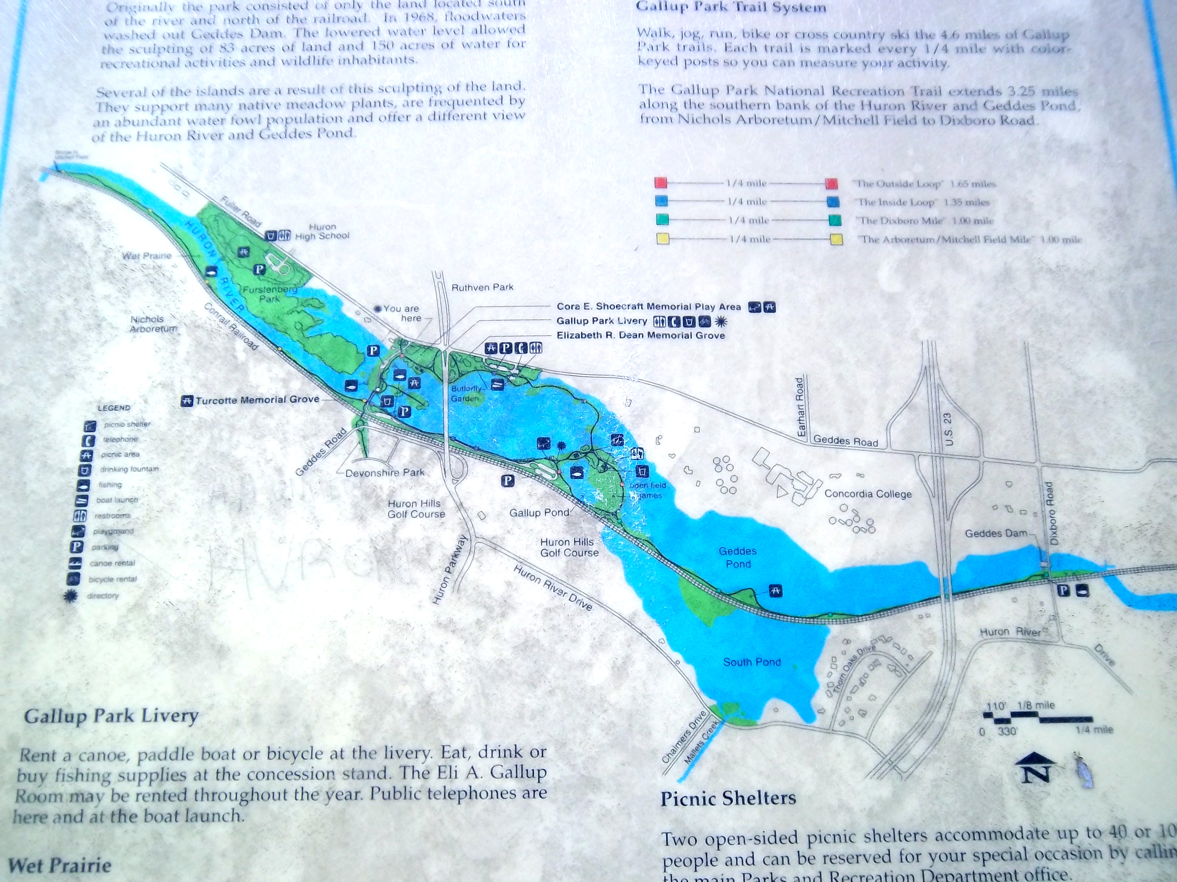 Finally, driving directions to Gallop Park – I am not going into details, because if you have read this post this far, you must live around here and know how to get there. Anyway, the best way is to get off US-23 at Geddes Rd, and take Geddes westbound to the intersection with Huron Parkway. There is Huron High School at the intersection, and the main entrance of Gallop Park is across Geddes Rd from Huron High.