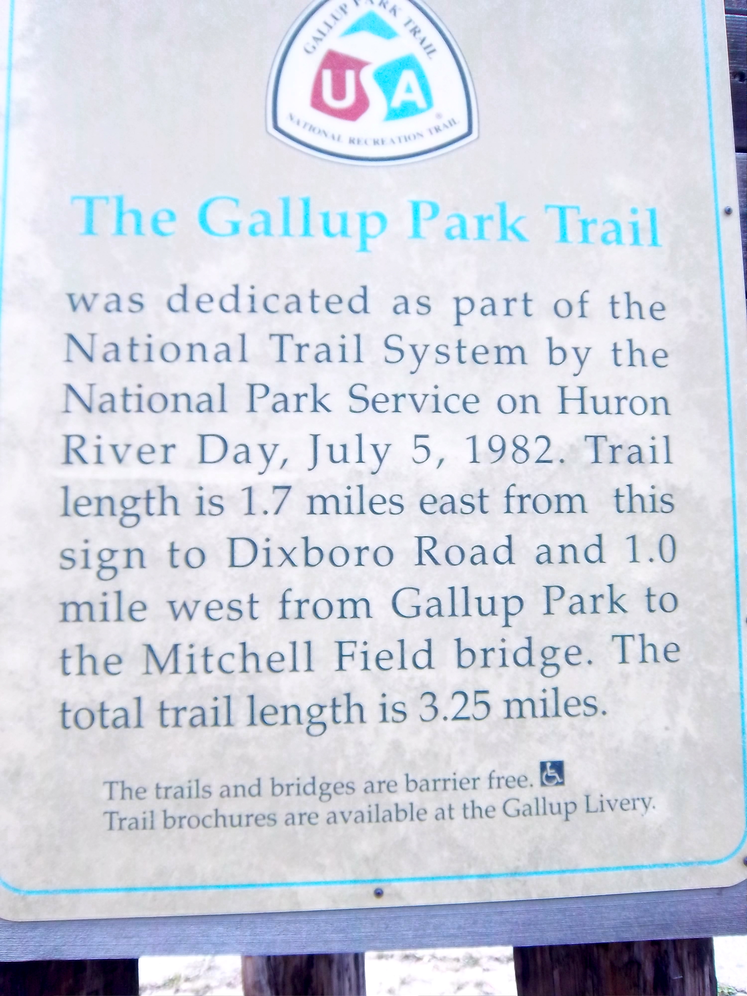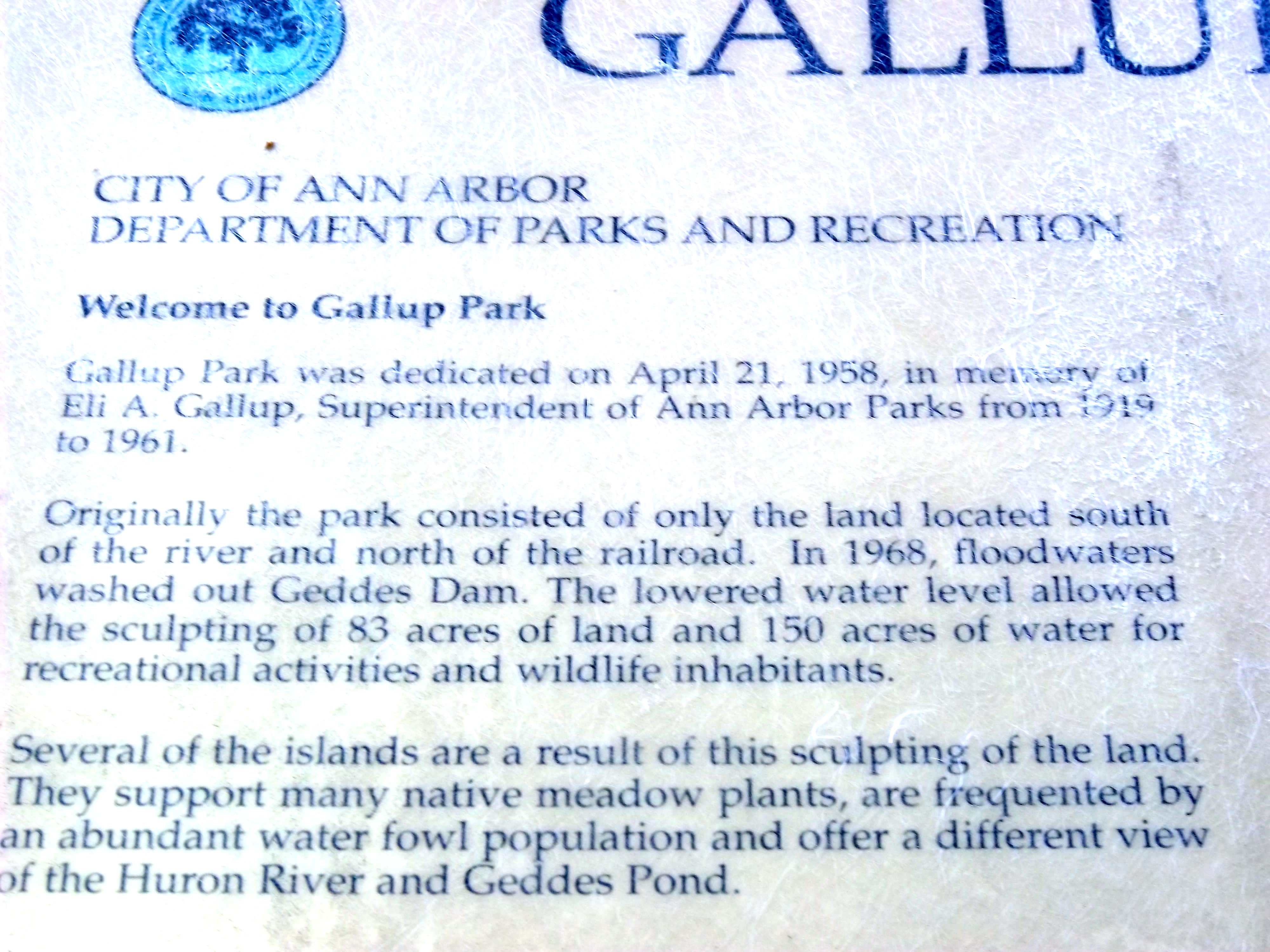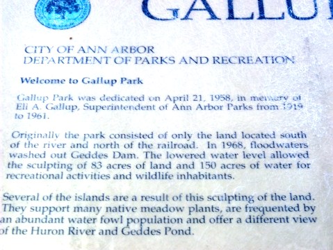 Did you know Gallop Park was named after Ms. Gallop who was the superintendent of Ann Arbor park? It was formed back in 1968 when the area was flooded. The islands in the river are the result of the flood.
