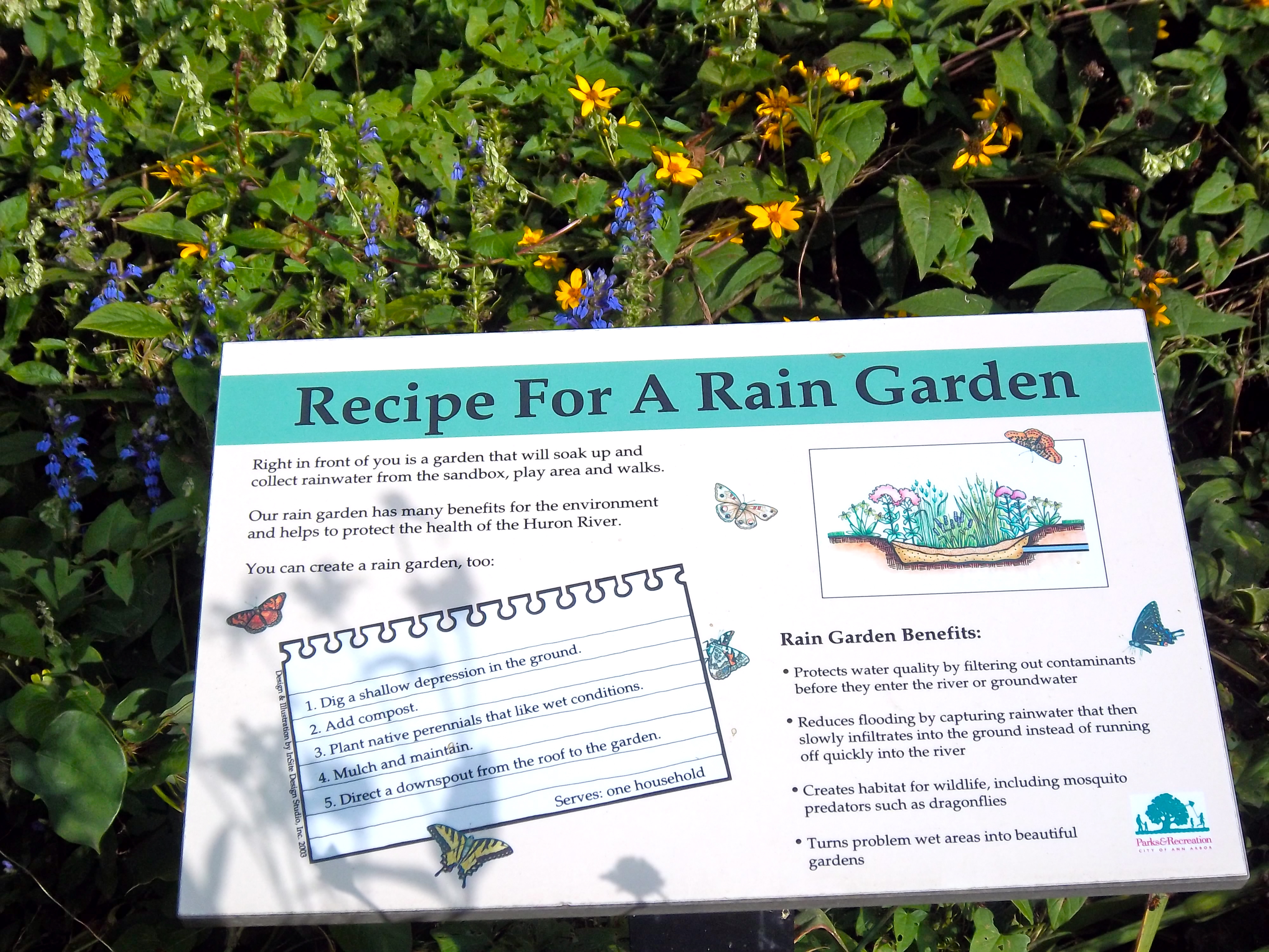 公園の一角に置いてある説明版。 雨水の有効な庭への使い方をアドバイスしている。雨水の活用は水資源の節約になり、環境にとって良いことだ。いかにもアナーバーらしいサイン。