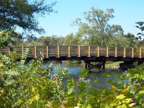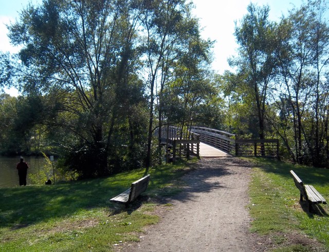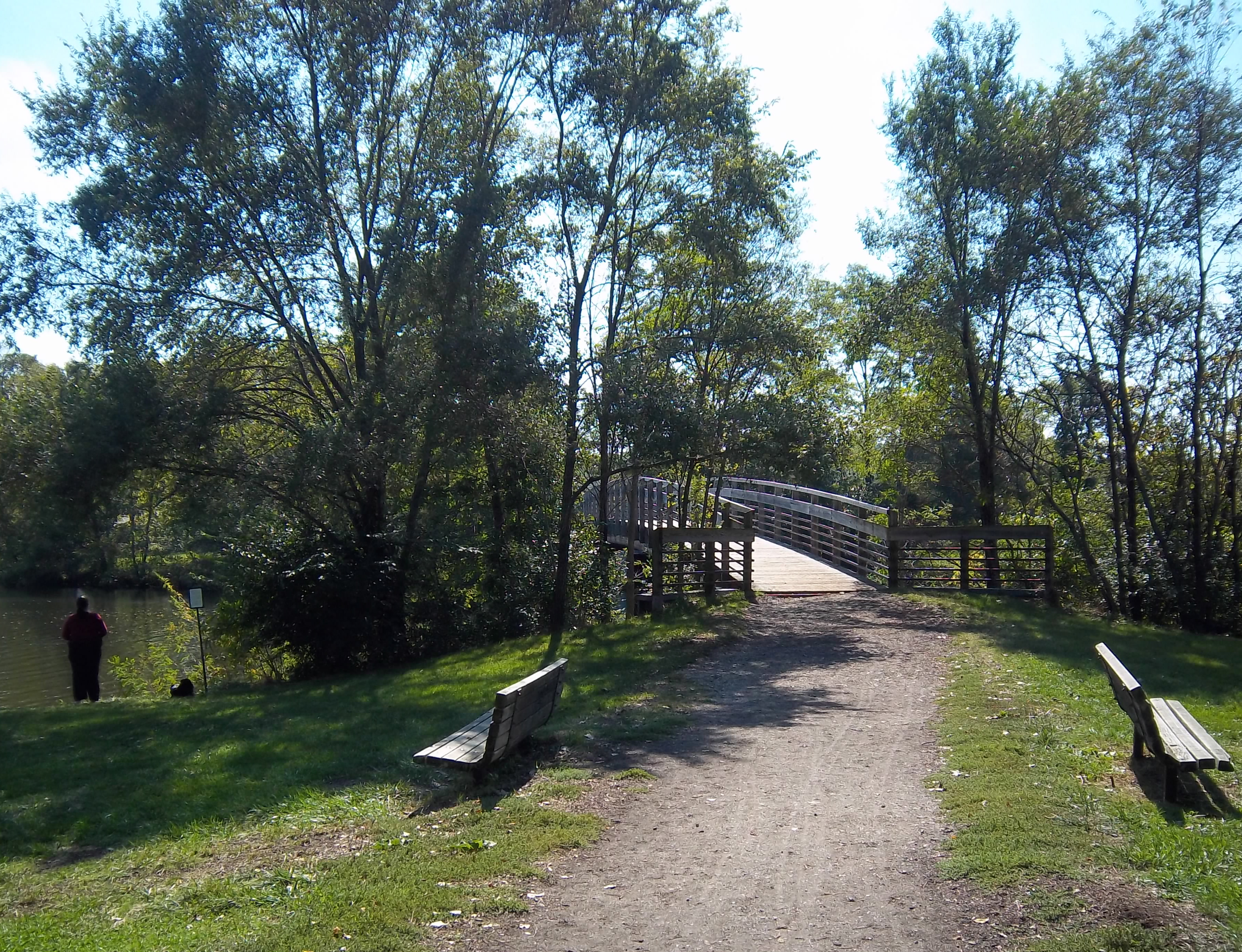 One of the small bridges over HuronRiver. A man fishing on the left – fishing is always popular in this park.