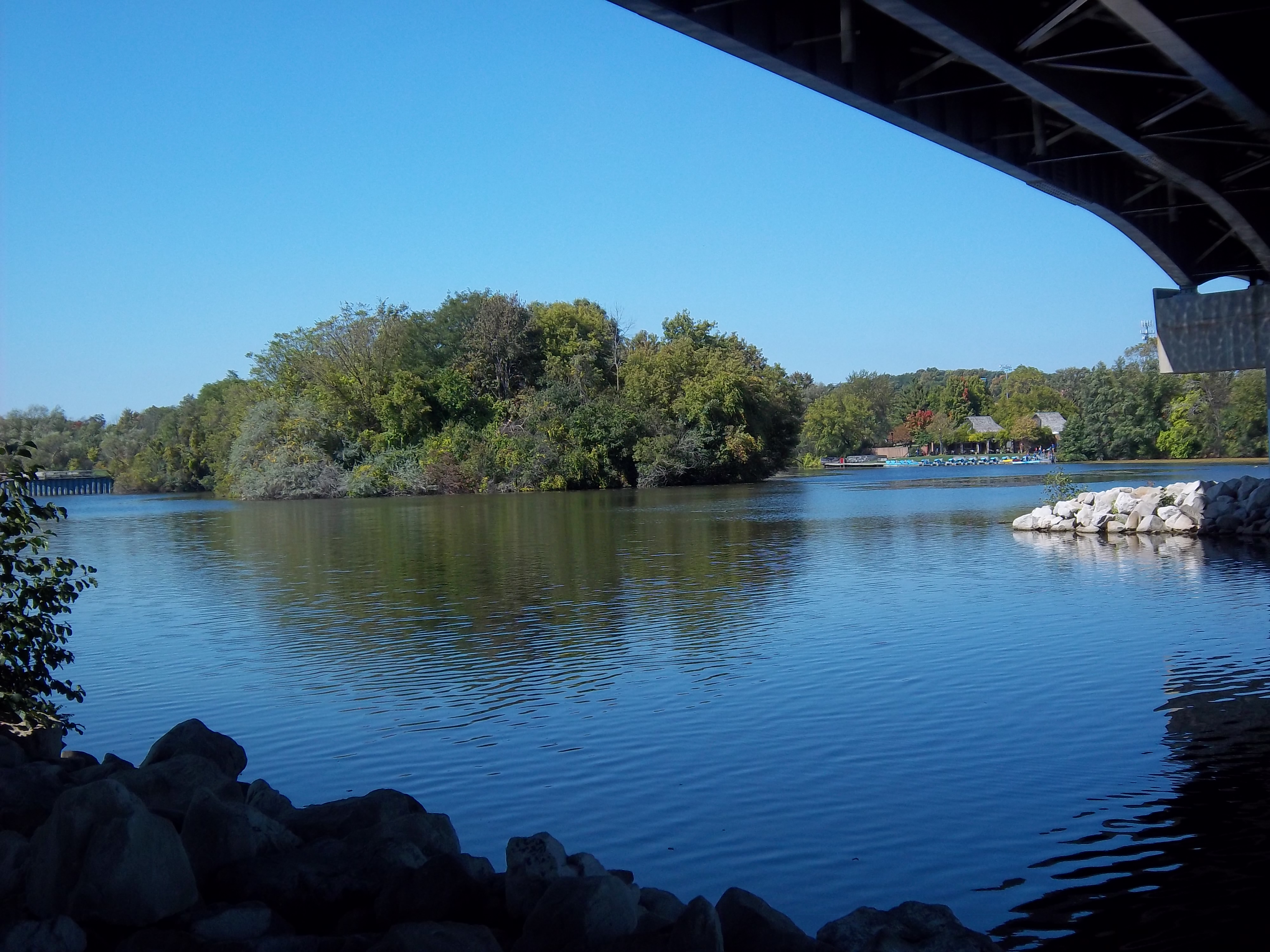 The bridge above is Huron Parkway. The island in the center is in the middle of Huron River. This area was flooded in 1968. After the flood, the water level went down and the islands were formed. These islands are paradises for water fowls and birds.